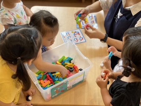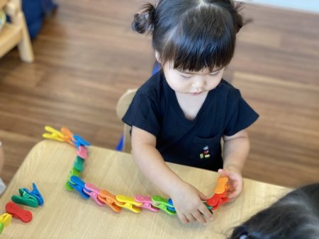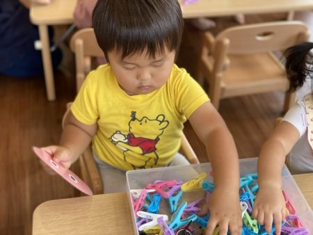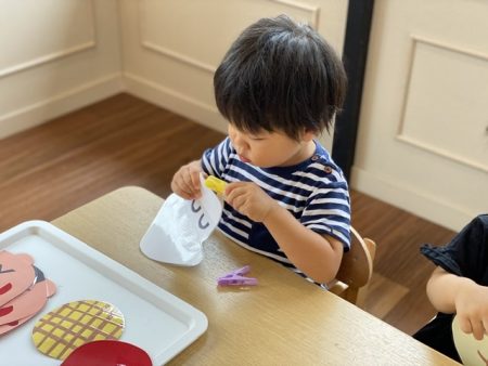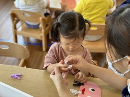 ゆめ組(2歳児)さんは、洗濯バサミを応用した『アイクリップ』というおもちゃを使って遊びました。