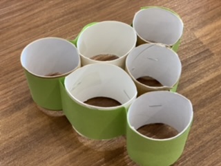 素材は、トイレットペーパーの芯、画用紙、セロハンです。