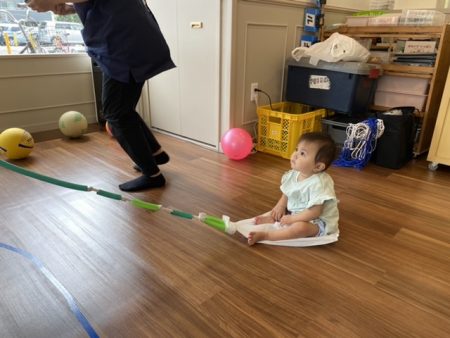 ビニール袋に座ってロープで引っ張ってもらう遊びはまる鳩の子達。